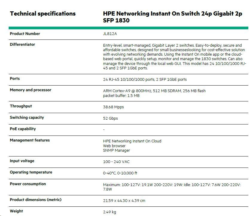| Aruba Instant On 1830 8G Switch (JL810A) | Aruba Instant On 1830 8G 4p Class4 PoE 65W Switch (JL811A) | Aruba Instant On 1830 24G 2SFP Switch (JL812A) | Aruba Instant On 1830 24G 12p Class4 PoE 2SFP 195W Switch (JL813A) | Aruba Instant On 1830 48G 4SFP Switch (JL814A) | Aruba Instant On 1830 48G 24p Class4 PoE 4SFP 370W Switch (JL815A) | ||||