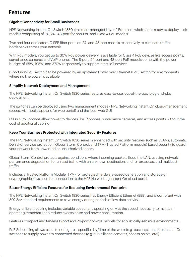 | Aruba Instant On 1830 8G Switch (JL810A) | Aruba Instant On 1830 8G 4p Class4 PoE 65W Switch (JL811A) | Aruba Instant On 1830 24G 2SFP Switch (JL812A) | Aruba Instant On 1830 24G 12p Class4 PoE 2SFP 195W Switch (JL813A) | Aruba Instant On 1830 48G 4SFP Switch (JL814A) | Aruba Instant On 1830 48G 24p Class4 PoE 4SFP 370W Switch (JL815A) | ||||||||