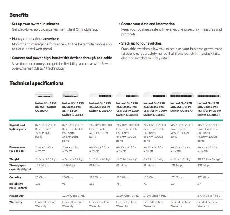 Řada přepínačů Aruba Instant On 1930 se vyznačuje snadným používáním a nasazením typu "plug-and-play" po vybalení z krabice.Řadu přepínačů Aruba Instant On 1930 lze nasadit pomocí dvou způsobů. Režimů správy - Instant On cloud-management (přístup přes síť). Druhou variantou je využití mobilní aplikace a/nebo webového portálu a místního webového grafického rozhraní.Řada přepínačů Aruba Instant On 1930 se vyznačuje snadným používáním a nasazením typu "plug-and-play" po vybalení z krabice.Řadu přepínačů Aruba Instant On 1930 lze nasadit pomocí dvou způsobů. Režimů správy - Instant On cloud-management (přístup přes síť). Druhou variantou je využití mobilní aplikace a/nebo webového portálu a místního webového grafického rozhraní.