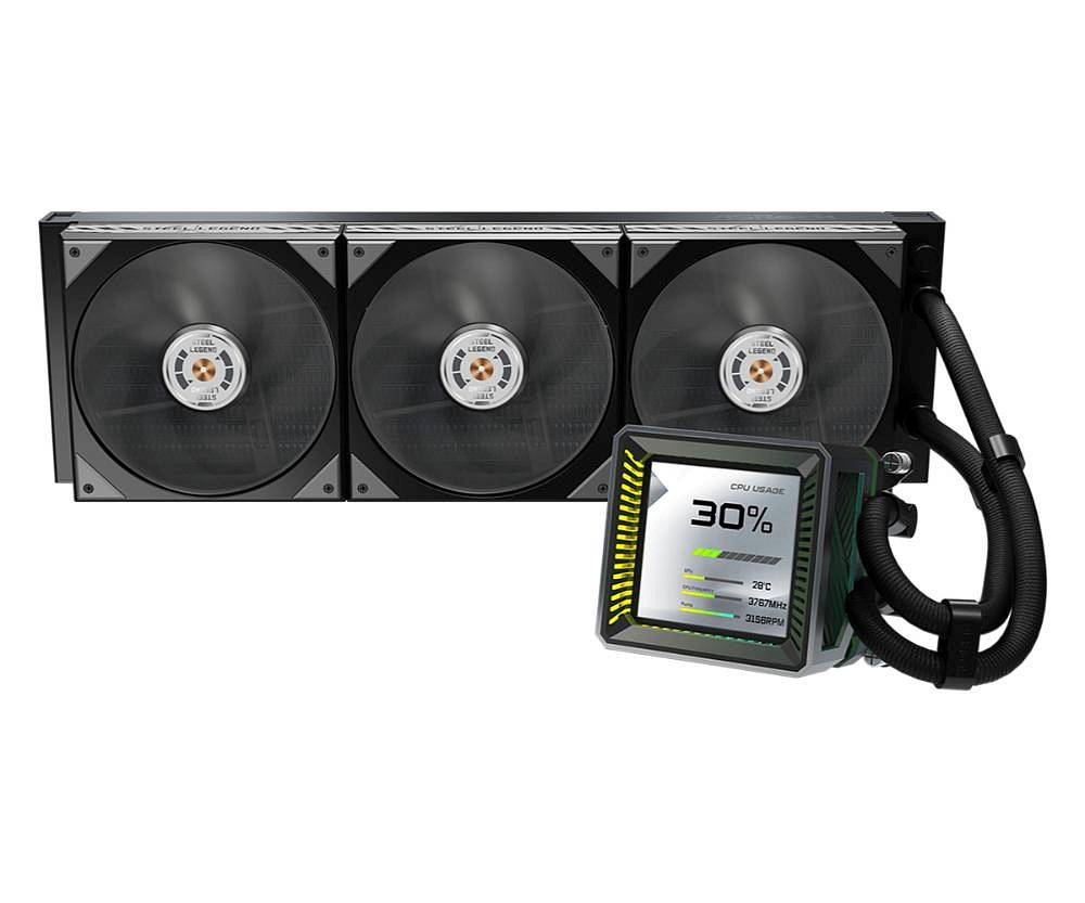 Vysoce výkonné AIO chlazení s 360mm radiátorem a integrovaným 3" LCD displejem pro monitoring systému nebo vlastní grafiku. Je osazeno prémiovými ventilátory s LCP lopatkami a průmyslovými kuličkovými ložisky pro maximální tlak a životnost. Kombinuje robustní konstrukci řady Steel Legend s tichým 3fázovým čerpadlem a plnou podporou nejnovějších socketů Intel i AMD.