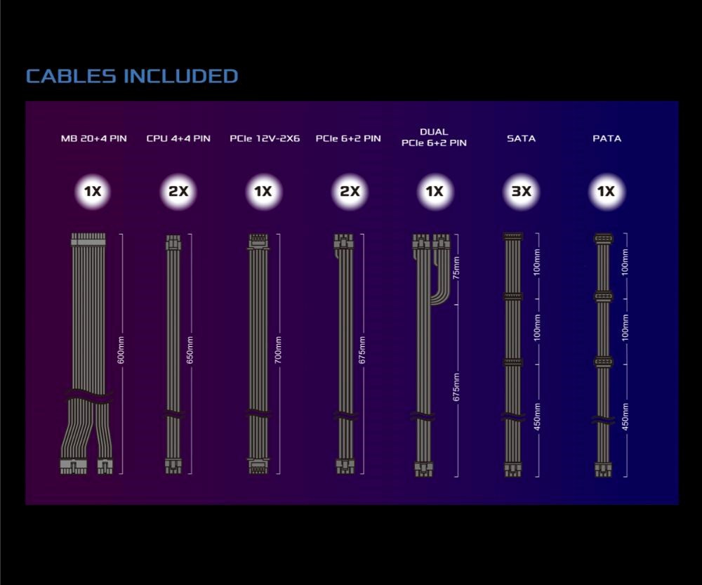 | Dueal PCIe 6+2 Pin Konektor | 1x / 2x (675 + 75 mm) |