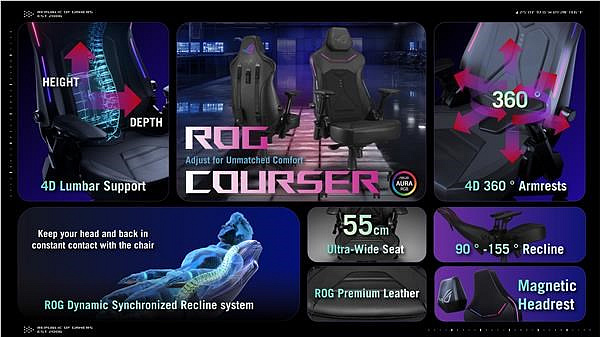 - Systém ROG Dynamic Synchronized Recline: Zajišťuje, že páteř uživatele je v neustálém kontaktu s opěrkou zad, čímž zabraňuje pocitu přetížení.