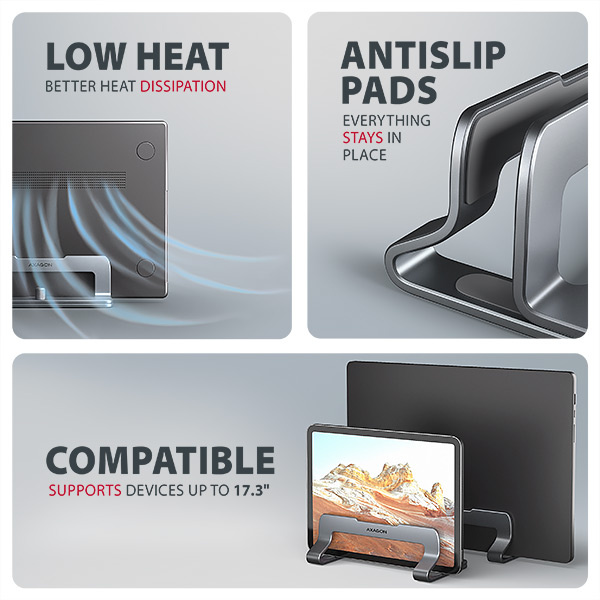 Vertikální stojan poskytuje notebooku více prostoru kolem ventilátorů, což zajišťuje účinnější odvod tepla a pomáhá udržet stabilní výkon i delší životnost zařízení. Zároveň udržuje klávesnici čistší a chrání notebook před prachem i náhodným politím, protože je zvednutý nad pracovní plochu.