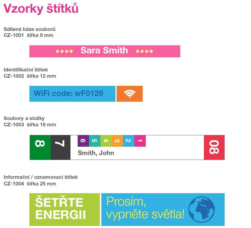 Typ média / Kontinuální plnobarevná role / Dostupné šířky pásek / 9, 12, 19, 25 a 50 mm