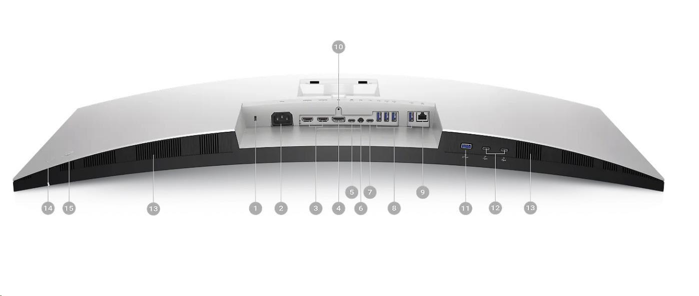 | 1. Security lock slot (based on Kensington Security Slot™) 2. Power connector 3. 2x HDMI 2.1 4. DisplayPort 1.4 5. USB Type-C upstream port (video and data). (Alternate mode with DisplayPort 1.4, Power Delivery up to 90W) 6. Audio line-out port 7. USB Type-C upstream port (data only, 10 Gbps, USB 3.2 Gen 2) 8. 4x USB Type-A downstream ports (SuperSpeed USB 10 Gbps, USB 3.2 Gen 2) 9. RJ45 connector 10. Stand lock 11. USB Type-A downstream port (SuperSpeed USB 10 Gbps, USB 3.2 Gen 2) with BC1.2 charging capability at 2A (max) 12. 2x USB-C downstream ports (SuperSpeed USB 10 Gbps, USB 3.2 Gen 2) with charging capability at 15W (max) 13. Speakers 14. Power On/Off button 15. Joystick |