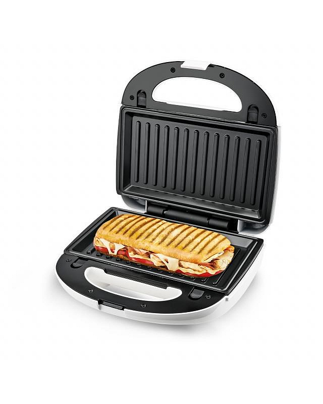 Trendem v kuchyni se stávají multifunkční pomocníci, kteří nezaberou mnoho místa, ale dokáží toho hodně. Součástí multifunkčního sendvičovače Orava ST-500 je až pět různých pečicích desek, což oceníte při přípravě rychlých teplých jídel, kterých se dospělí i děti nemohou nabažit. Pokud jde o přípravu syté snídaně, rychlé večeře nebo sladkého pohoštění jako odměna po celodenní práci, je na čase ho vyndat z poličky. Díky příkonu 750 W v něm rychle připravíte lahodné tousty pro své blízké, ugrilujete kuře, upečete panini, připravíte sladké vafle, zbožňované koblihy a sladké pečivo ve tvaru nápaditých lastur vlastní výroby. Stačí si vybrat jednu z pěti přiložených desek, které díky posuvným zámkům bez námahy a bezpečně vložíte do spotřebiče - a příprava pokrmů může začít. Přestože spotřebič peče a zapéká, můžete si být jisti, že je o vaši bezpečnost postaráno. Spotřebiči nechybí tepelná pojistka a dostatečně velká rukojeť je navíc tepelně izolovaná. Červená nebo zelená kontrolka jasně ukazuje, kdy topinkovač pracuje na plné obrátky. Díky nepřilnavému povrchu se navíc pečicí desky snadno čistí, což z něj spolu s širokými možnostmi přípravy pokrmů dělá topinkovač, který si v kuchyni oblíbíte.