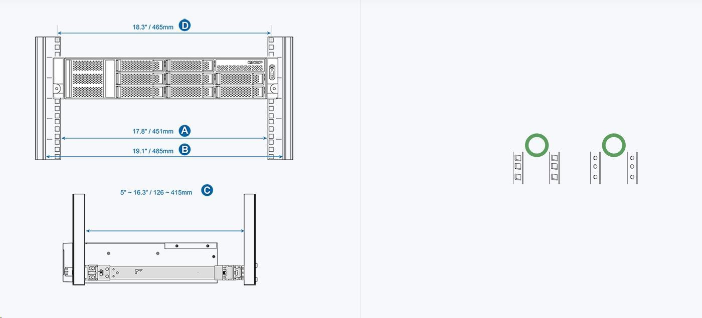 Sady kolejnic QNAP Rail Kits pomáhají při instalaci QNAP NAS do racku. Posuvné kolejnice umožňují zasunutí QNAP NAS dovnitř a vysunutí ven pro snadnou údržbu a správu. Modely QNAP NAS určené do racku vyhovují standardům rackové montáže ANSI/EIA-RS-310-D. Než nakoupíte serverový rack, nejprve se prosím ujistěte, zda tento serverové rack odpovídá příslušným specifikacím.