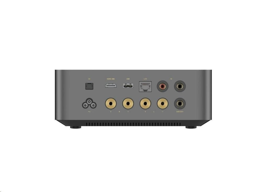 Vstupy: 1x RCA, 1x optický (PCM 192kHz/24-bit), HDMI ARC (PCM/Dolby Digiital), USB A (24-bit/192kHz), Ethernet (100Mbps)