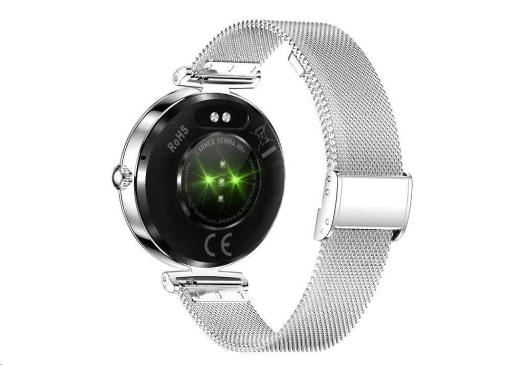 Moderní, luxusní fitness hodinky Carneo Seinna HR+ v elegantním stříbrném provedení disponují SUPER AMOLED displejem, který lze aktivovat jednoduchým otočením ruky. Měří srdeční tep, krevní tlak, okysličení krve, ujetou vzdálenost, spálené kalorie a kvalitu spánku. Jejich součástí je baterie s výdrží cca 4–5 dní. Podle certifikace IP68 jsou odolné vůči vodě a prachu. Hodinky s podporou technologie Bluetooth 5.2 jsou kompatibilní s operačním systémem iOS a Android. Kovový, pletený řemínek je příjemný na dotek a zaručuje komfort po celý den. Řemínek je možné vyměnit za světle šedý silikonový řemínek, který je součástí balení.
