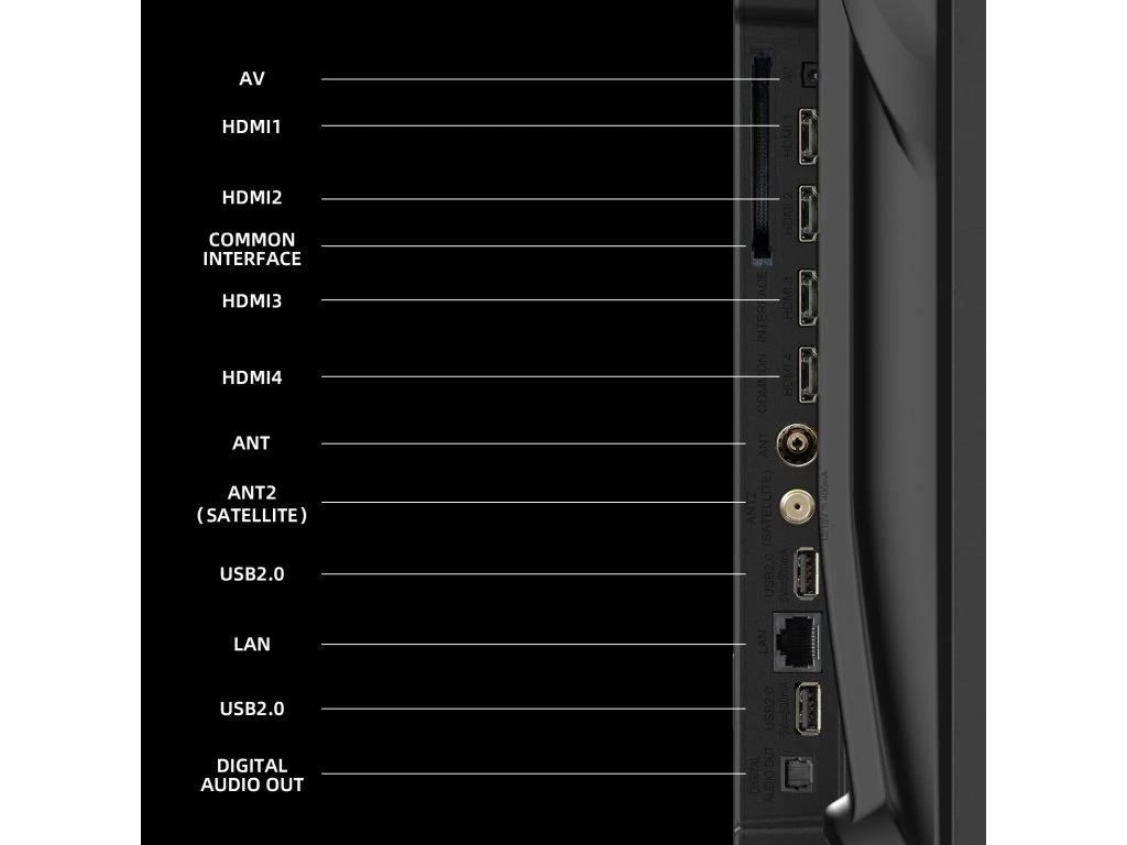 žitečná připojení najdete zezadu i z boku pro snadnější obsluhu. TV má 3 vstupy HDMI 2.1 (z toho jeden s HDCP / eARC / CEC) a 2 vstupy USB.