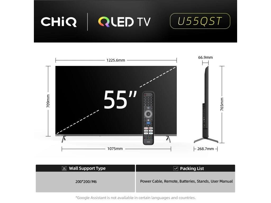 CHiQ 55“ U55QST, ultratenká metalická bezrámečková QLED Smart Google TV 5.0 s několika herními funkcemi, HDR10, HLG, obrazovkou s Ultra HD s rozlišením 3840 x 2160 pixelů, prostorovým zvukem Dolby Audio a dbx-tv.