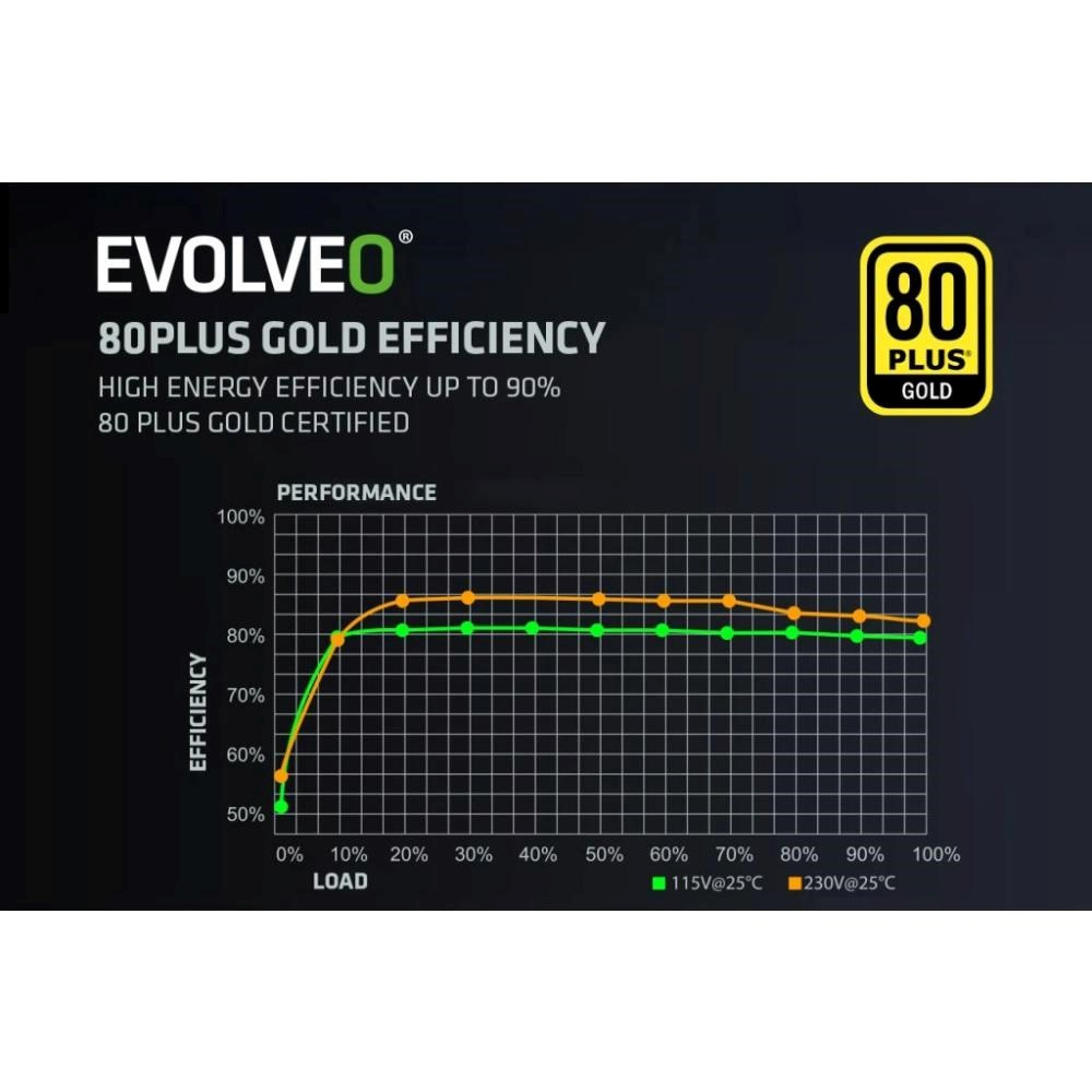PC zdroj EVOLVEO G650-BK je hrdým držitelem certifikace 80 PLUS Gold, která slibuje až 92% účinnost (při běžném 50% zatížení). Minimální ztráty energie a nízké zahřívání jdou přitom ruku v ruce s tichým chodem 140mm HDB ventilátoru – ten má mezi hřídelí a ložisky speciální olejovou vrstvu a jeho tření je nepatrné, takže hlučnost zůstává na minimu. S tímto zdrojem vás zkrátka hučení ventilátoru neruší – slyšet je jen svištění kol vaší formule nebo řinčení zbraní vaší armády.