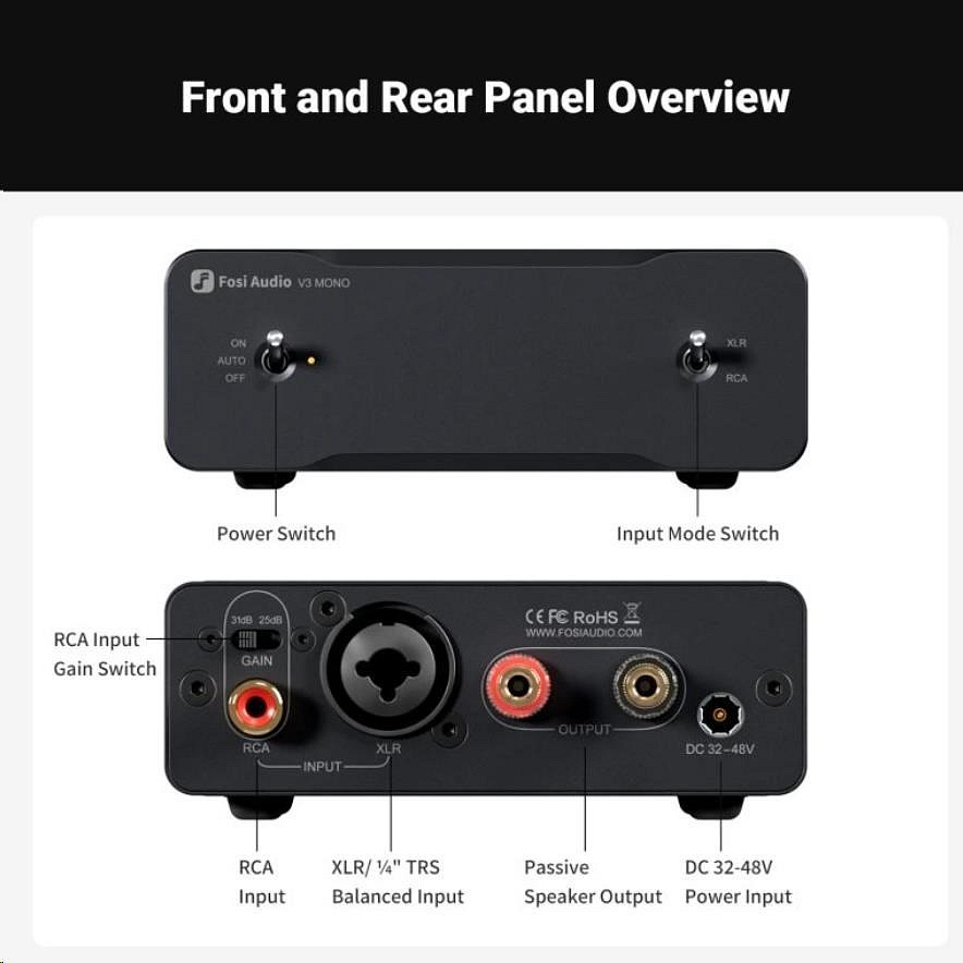 V3 Mono podporuje více typů vstupů: RCA (nevyvážený), XLR nebo TRS (vyvážený). Přepínání vstupů probíhá jednoduchým mechanickým přepínačem na čelním panelu.