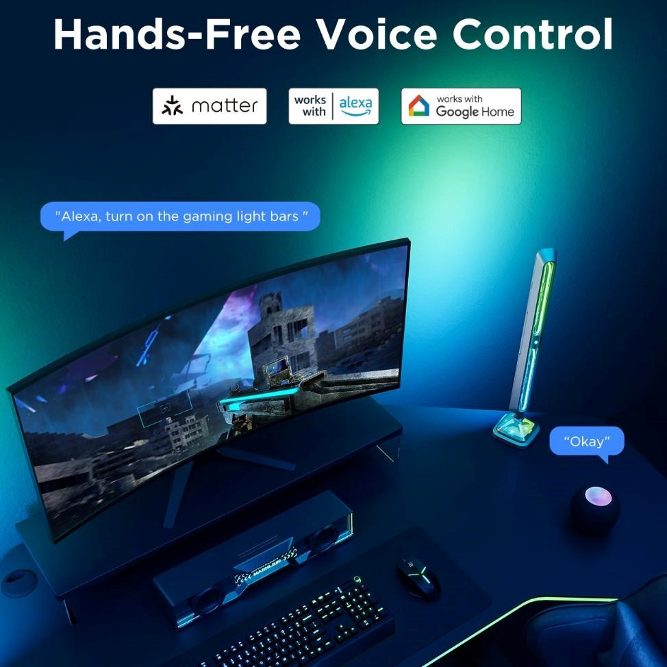 Panely nabízí širokou kompatibilitu s různými smart platformami. Podporují standard Matter, což znamená plnou kompatibilitu s Apple HomeKit, a také fungují s běžnými chytrými domácími asistenty jako Google Home a Amazon Alexa. Kromě toho jsou světelné lišty integrovány i s oblíbenými herními ekosystémy, jako jsou Razer Chroma a Corsair iCUE, takže je můžete snadno synchronizovat s dalšími herními periferiemi a vytvořit tak ucelený světelný zážitek napříč všemi zařízeními.