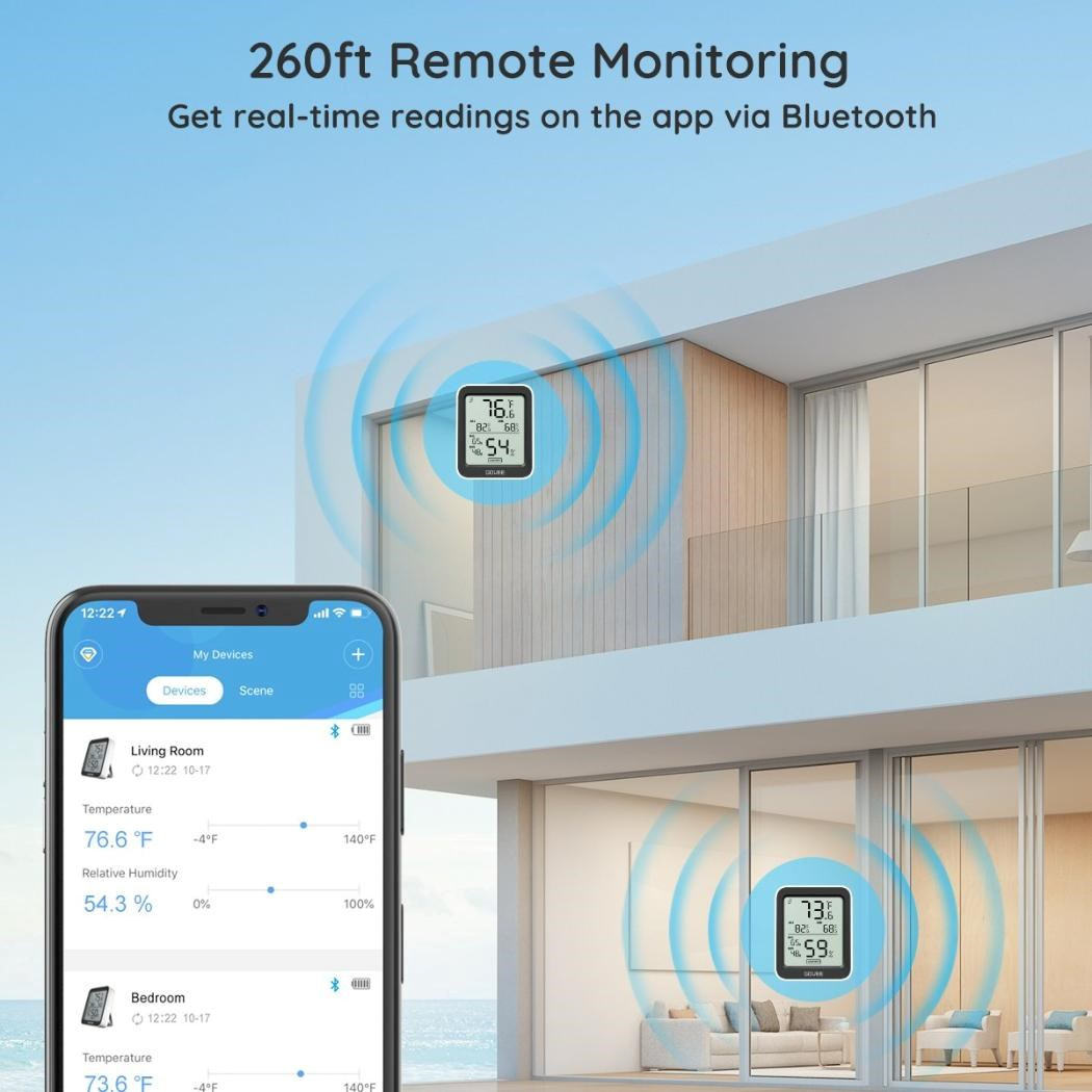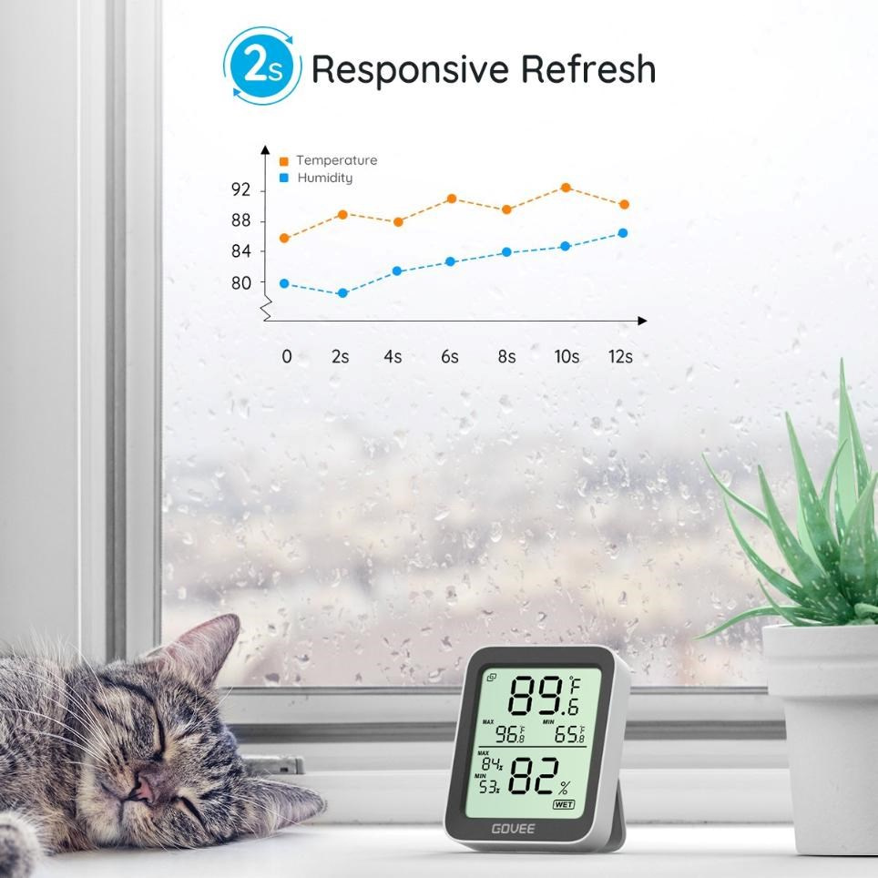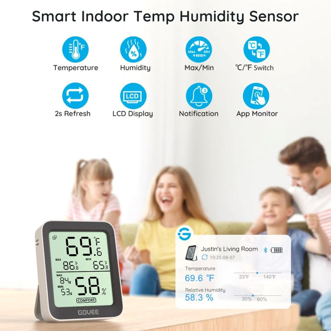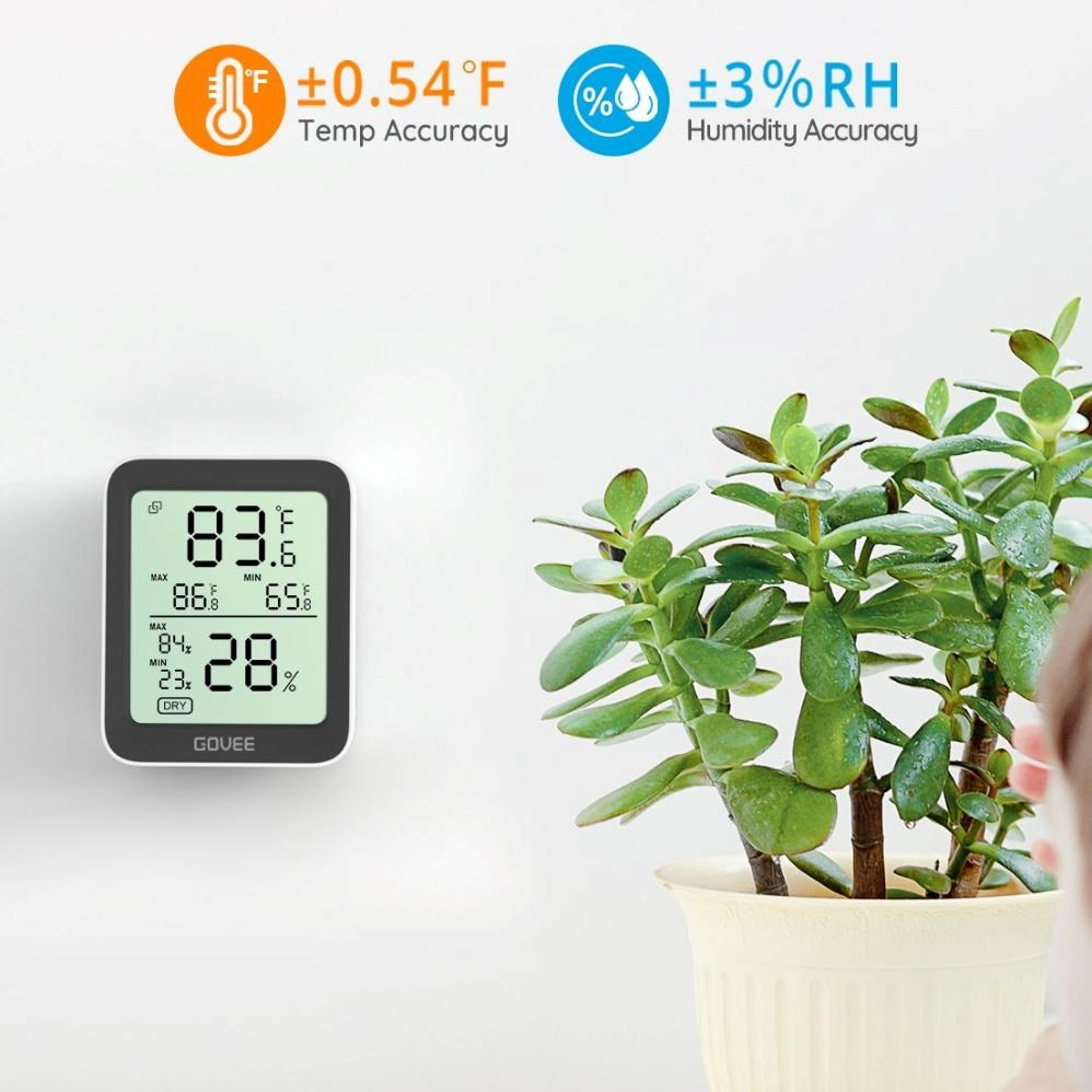 Udržujte své vnitřní prostředí pohodlné a zdravé. Chytrý monitor teploty a vlhkosti od Govee. Tento kompaktní, ale výkonný monitor klimatu zobrazuje aktuální teplotu a vlhkost na přehledném LCD displeji a díky Bluetooth připojení k telefonu máte data vždy na dosah ruky. Díky vysoce přesným senzorům (±0,3 °C pro teplotu a ±3 % RH pro vlhkost) můžete snadno sledovat změny v každé místnosti, kanceláři nebo skleníku.