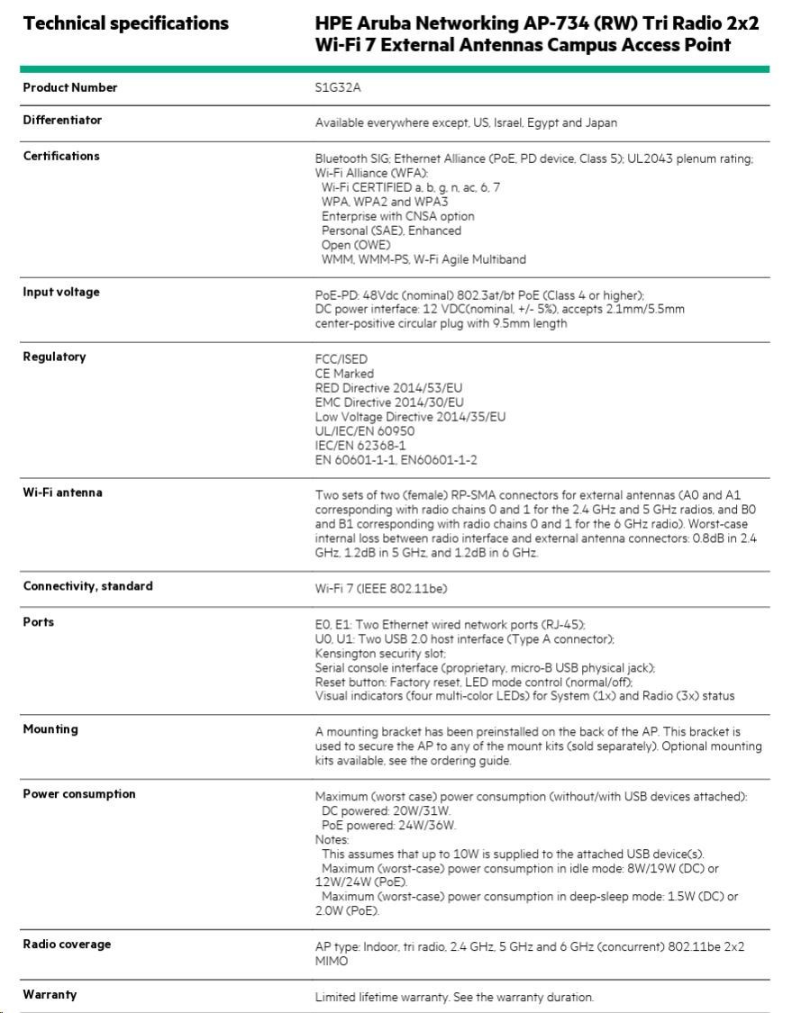HPE Aruba Networking AP-734 (RW) Tri Radio 2x2 Wi-Fi 7 External Antennas Campus Access Point S1G32AR RENEW.