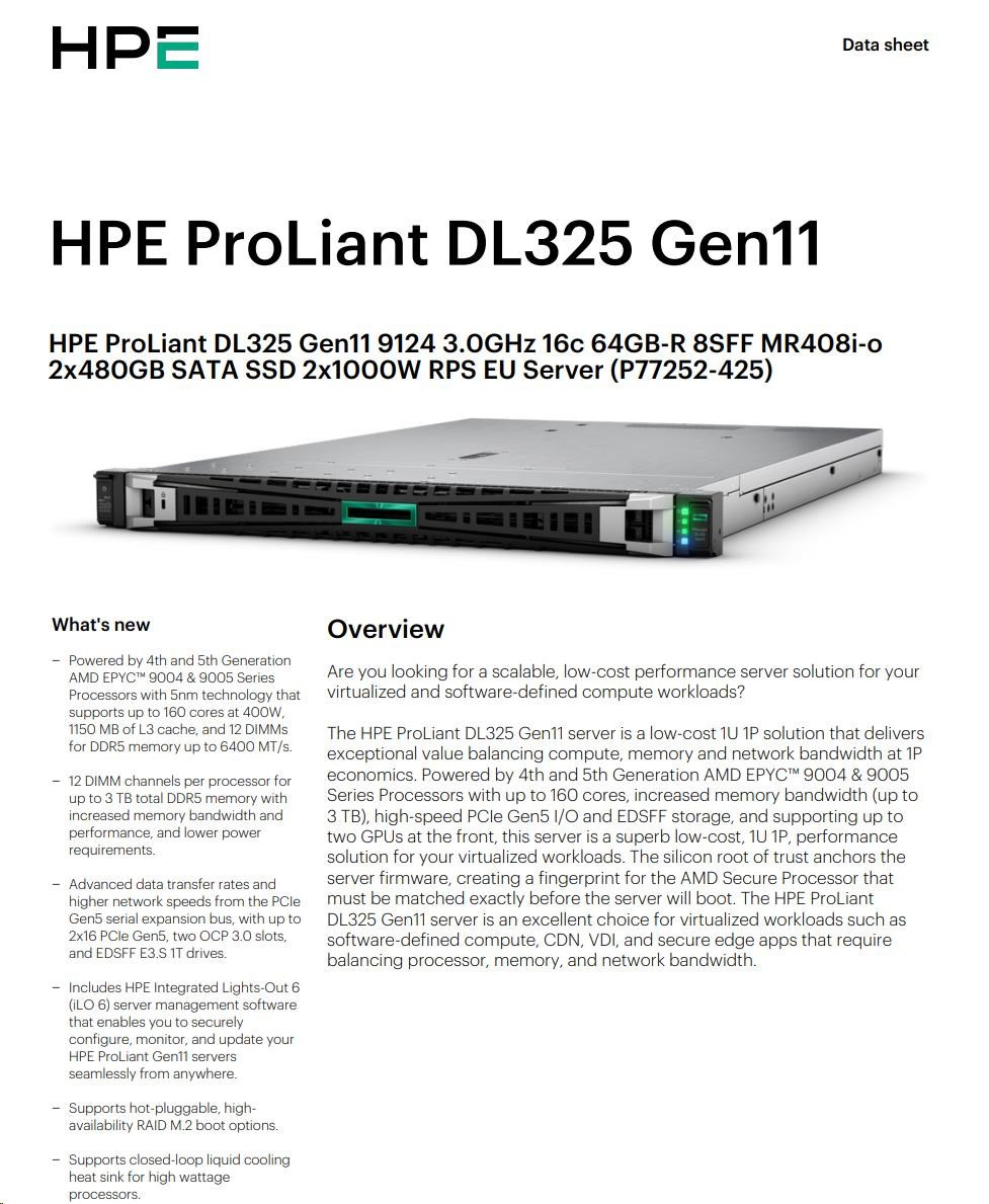 Model Name | HPE ProLiant DL325 Gen11 9124 3.0GHz 16c 64GB-R 8SFF MR408i-o 2x480GB SATA SSD 2x1000W RPS EU Server |