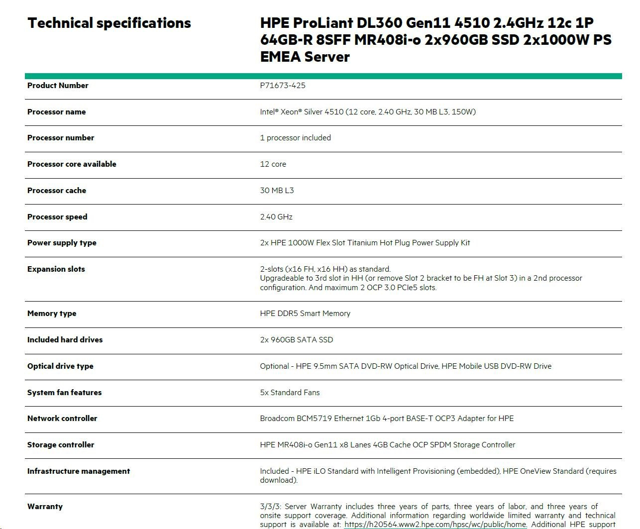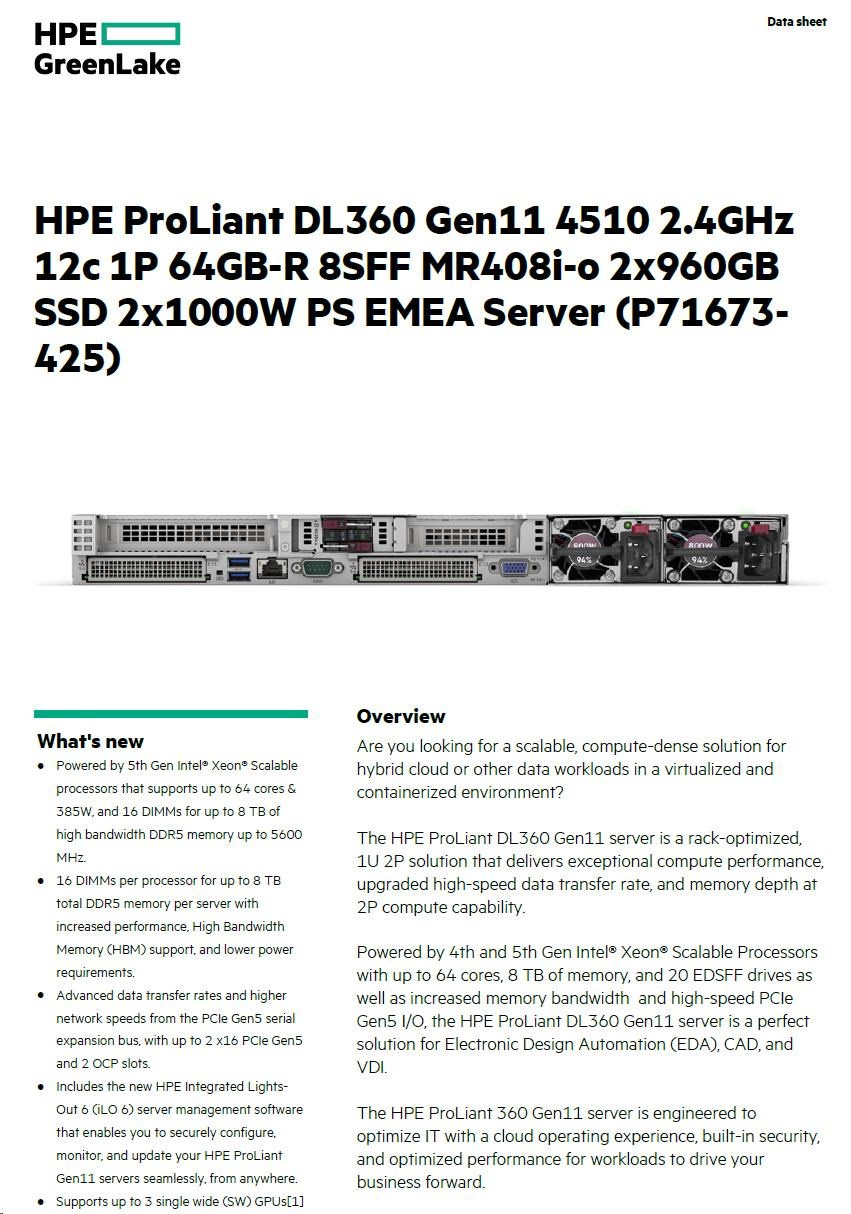 | Model Name | HPE ProLiant DL360 Gen11 4510 2.4GHz 12c 1P 64GB-R 8SFF MR408i-o 2x960GB SSD 2x1000W PS EMEA Server |