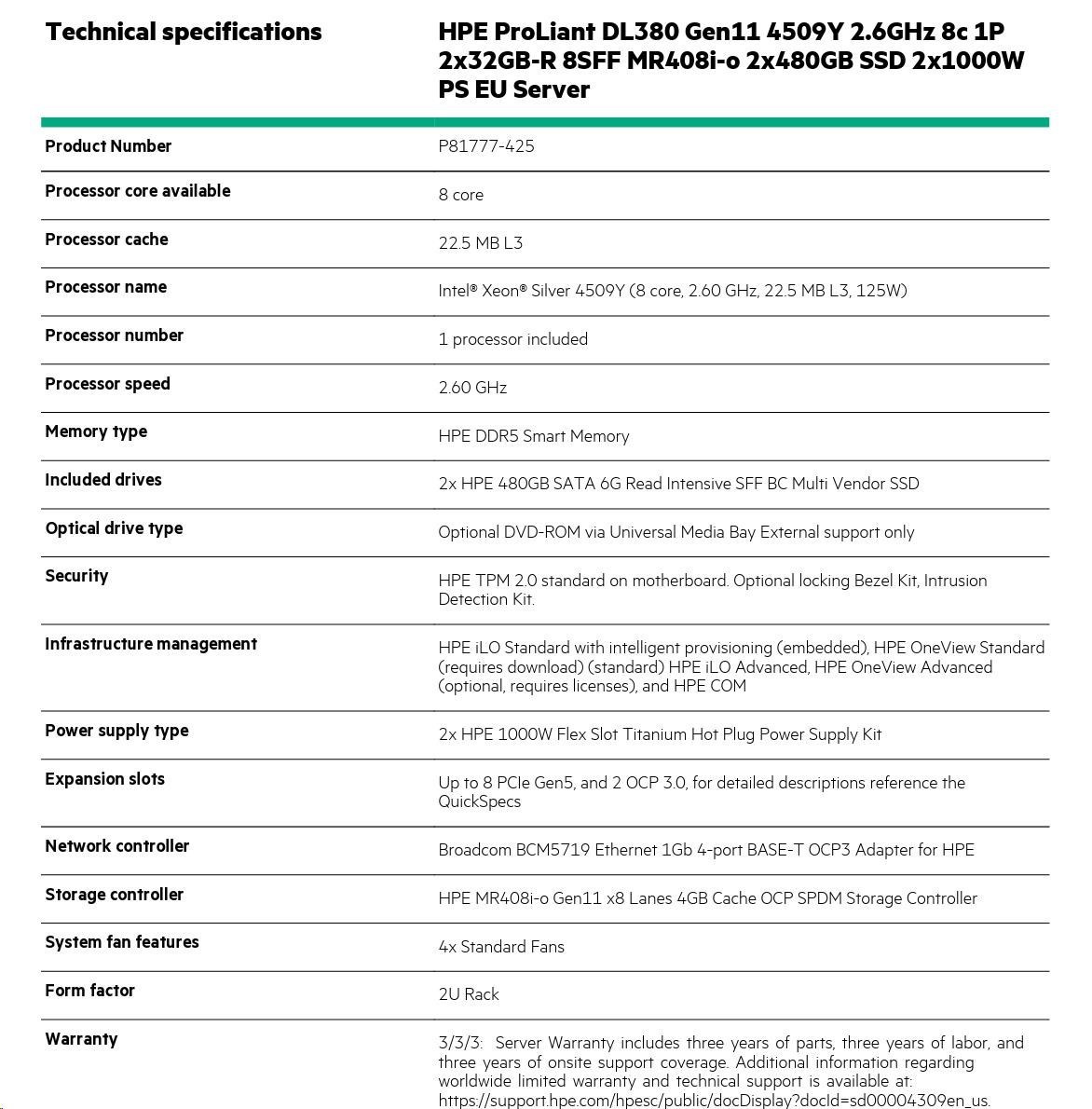 HPE PL DL380g11 4509Y (2.6/8C) 2x32G (p64706) 8SFF MR408i-o 2x480G 2x1000W 4x1Gb NBD333 Smart Choice