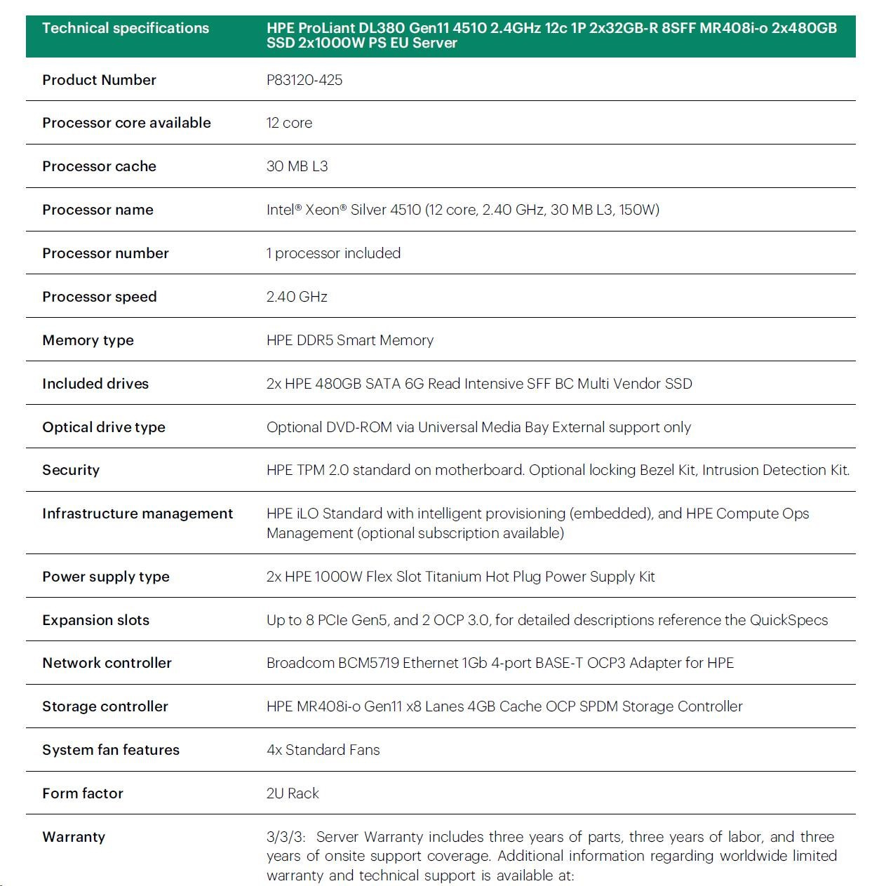 HPE PL DL380g11 4510 (2.4G/12C) 2x32G (p64706) 2x480G 8SFF MR408i-o 2x1000W 4p1To Smart Choice