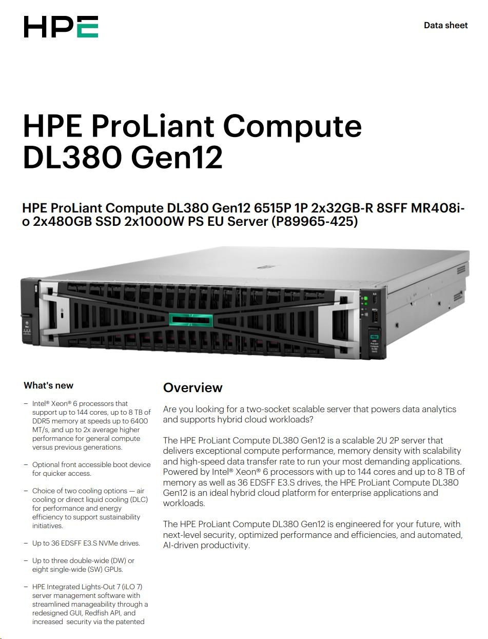 HPE PL DL380g12 6515P (2.4/16C) 2x32G (P69727) 2x480G MR408i-o 8SFF 2x1000W 2p10G-T NBD333 Smart Choice.