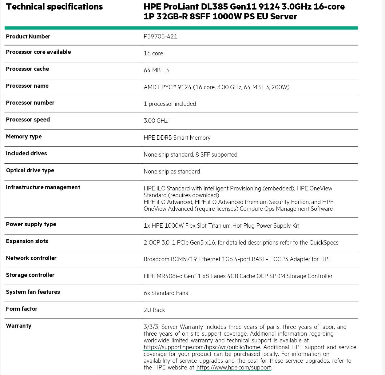 Model Name | HPE ProLiant DL385 Gen11 9124 2.7GHz 16-core 1P 32GB-R 8SFF 800W PS Server |