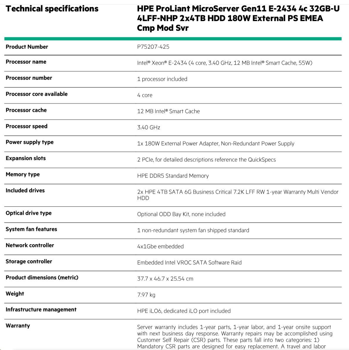 Model Name | HPE ProLiant MicroServer Gen11 E-2434 4c 32GB-U 4LFF-NHP 2x4TB HDD 180W External PS EMEA Cmp Mod Svr |