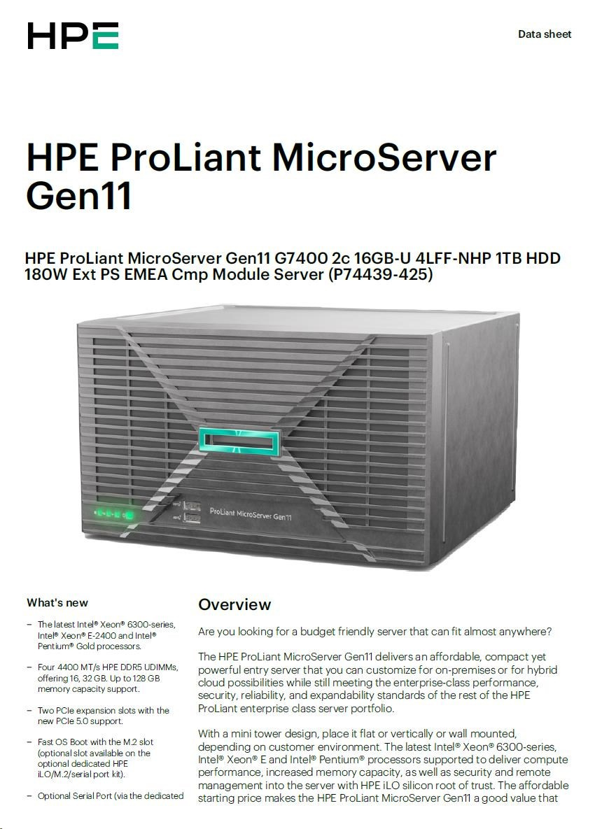 | P74439-425: HPE ProLiant MicroServer Gen11 G7400 2c 16GB-U 4LFF-NHP 1TB HDD 180W Ext PS EMEA Cmp Module Server |