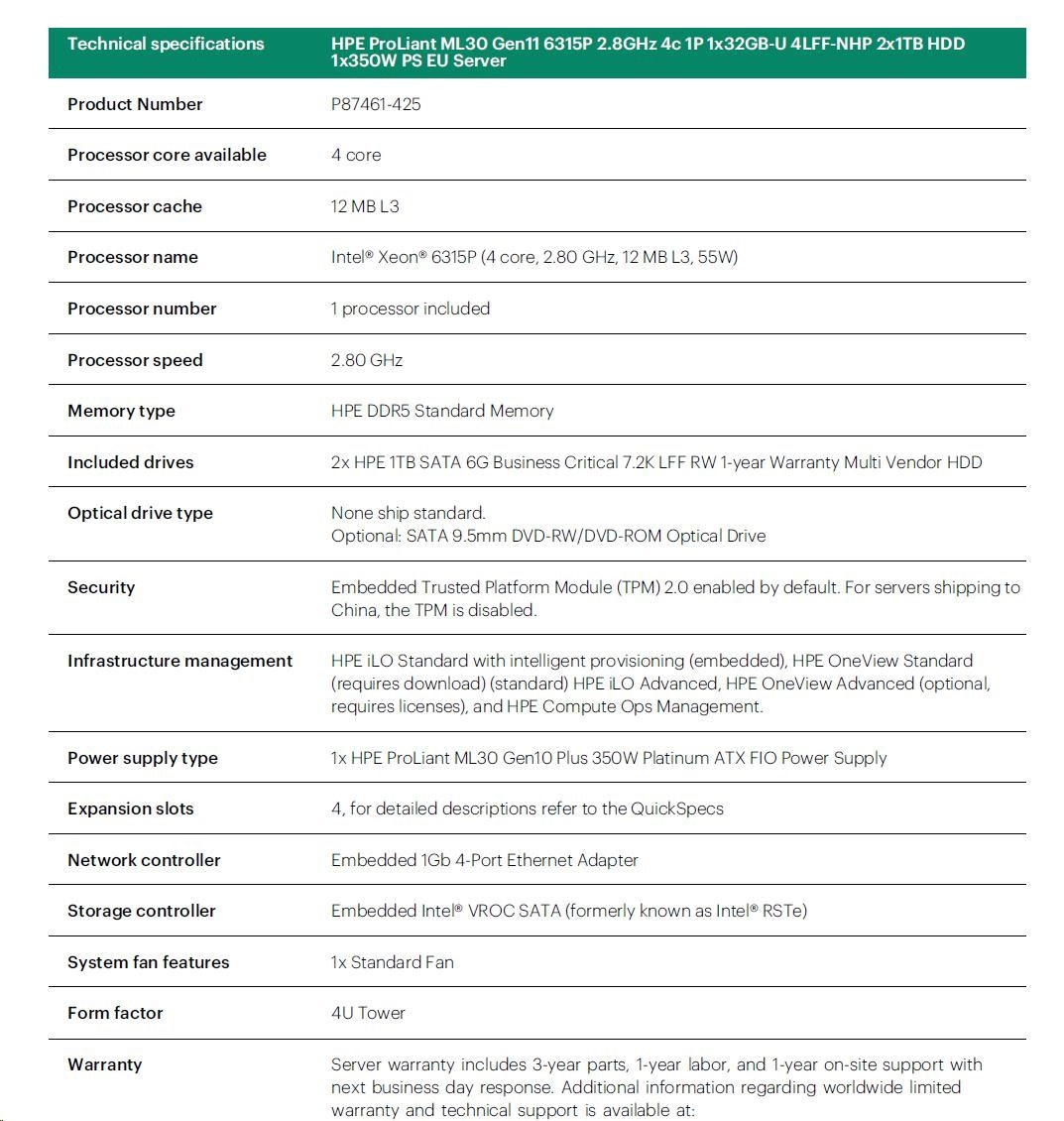 HPE PL ML30g11 6315P (2.8-5.2G/4C4T) 1x32G 2x1TB SATA 4LFF-NHP 1x350 VROC 4p1G NBD311 Smart Choice.