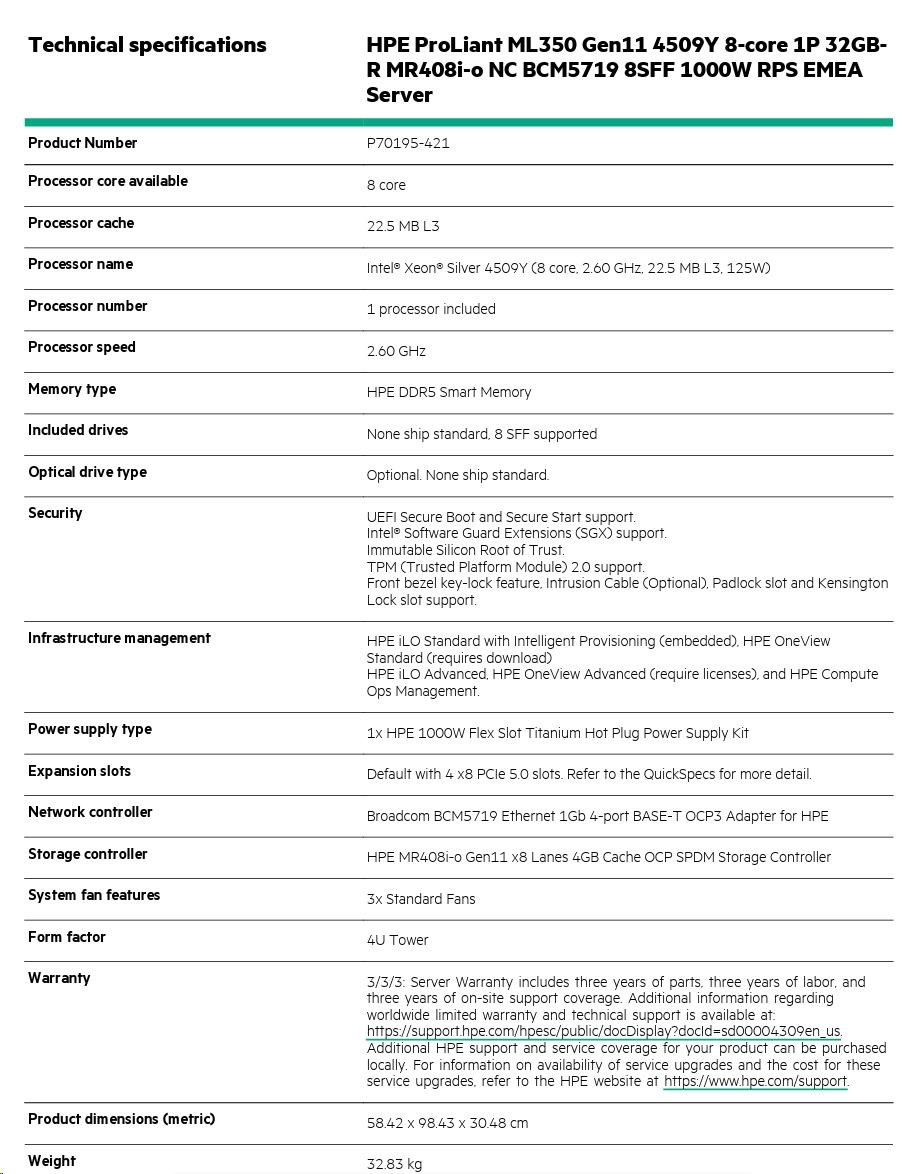 SKU Number | P70195-421: HPE ProLiant ML350 Gen11 4509Y 8-core 1P 32GB-R MR408i-o NC BCM5719 8SFF 1000W RPS EMEA Server |