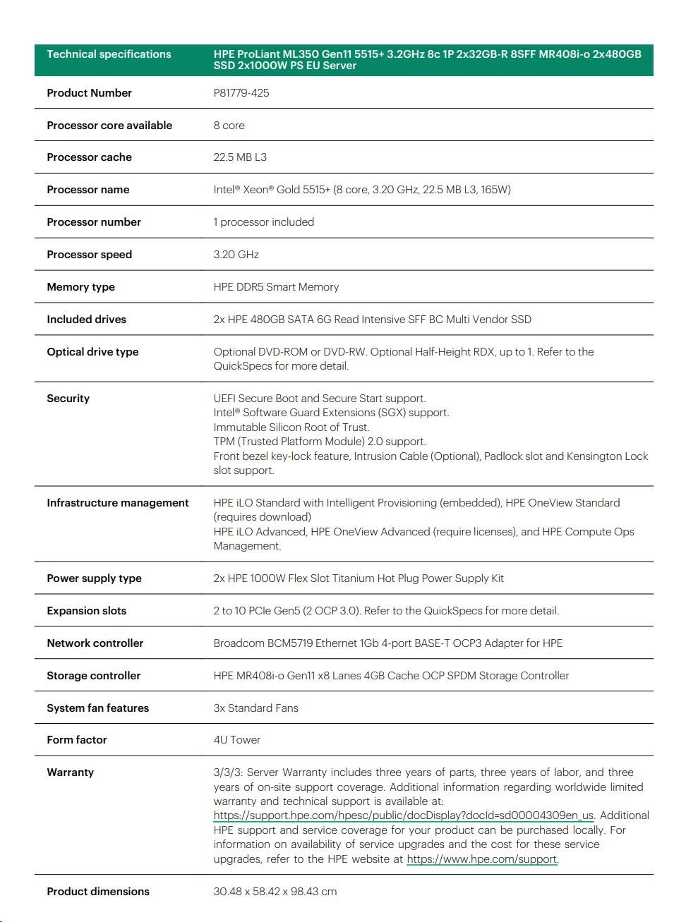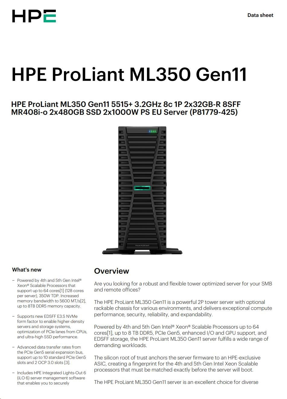 HPE PL ML350g11 5515+ (3.2G/8C) 2x32G (P64706) 8-24SFF MR408i-o/4G 2x480G SSD 2x1000W 4x1G Smart Choice.