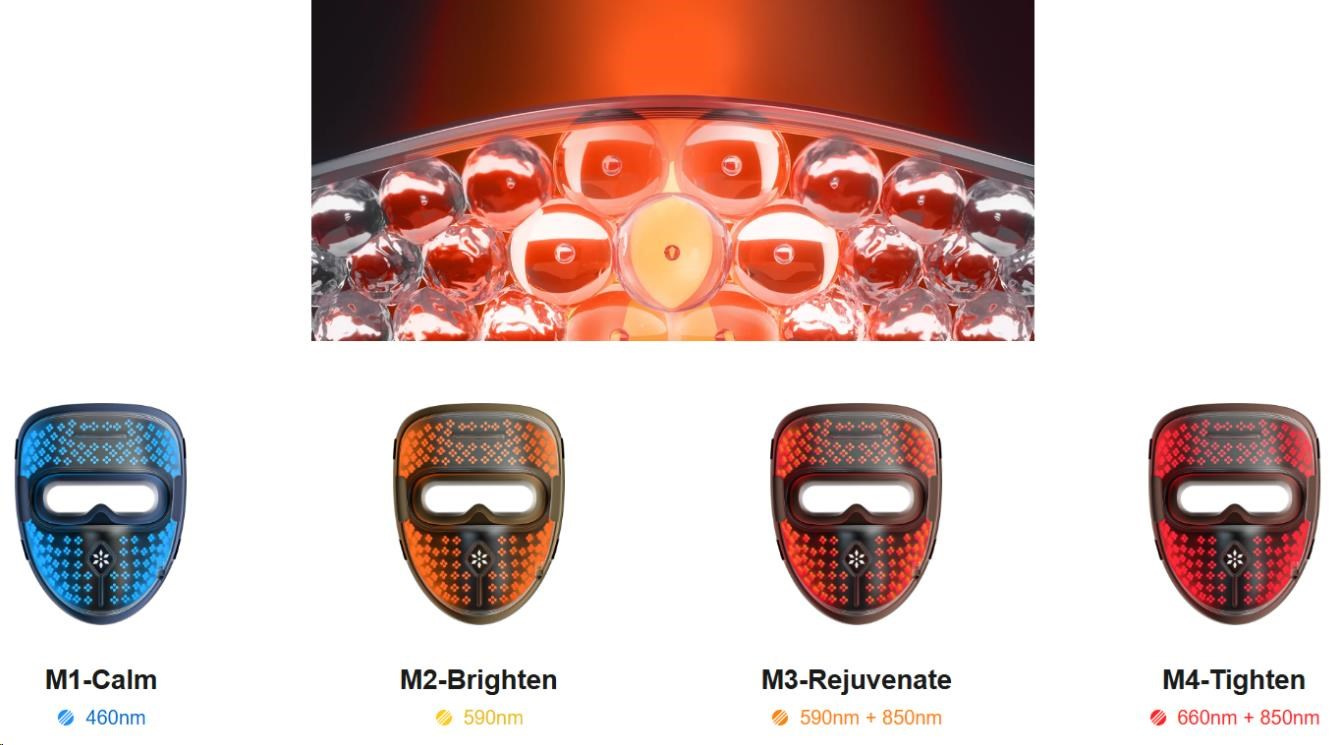 Tato maska není jen obyčejným doplňkem – je to výkonný nástroj pro komplexní omlazení a léčbu pleti. V jejím srdci se skrývá celkem 328 (82 x 4) vysoce intenzivních LED diod, které vyzařují čtyři typy klinicky ověřeného světla. Každá vlnová délka cílí na specifické problémy v různých vrstvách pokožky – od boje proti akné, přes rozjasnění pleti, až po hloubkovou stimulaci kolagenu pro redukci vrásek.