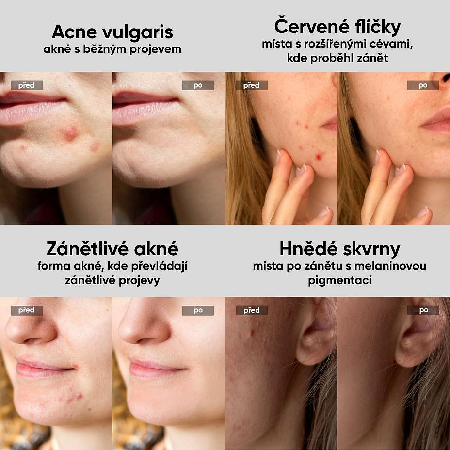 • Pásmo 800-1200nm: Proniká hlouběji do pokožky, kde působí na mazové žlázy. Inhibuje jejich nadměrnou aktivitu, vyrovnává produkci mazu a zabraňuje ucpávání pórů. Zároveň stimuluje regeneraci kolagenu, což urychluje hojení a zesvětlování stop po akné.