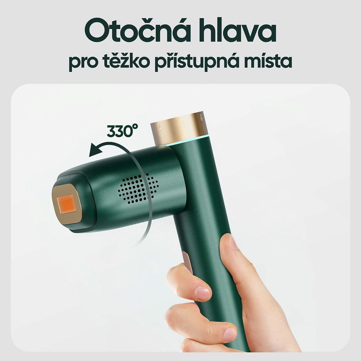 - Inovativní otočná hlavice o 330°: Umožňuje snadný a přesný přístup ke všem křivkám těla.