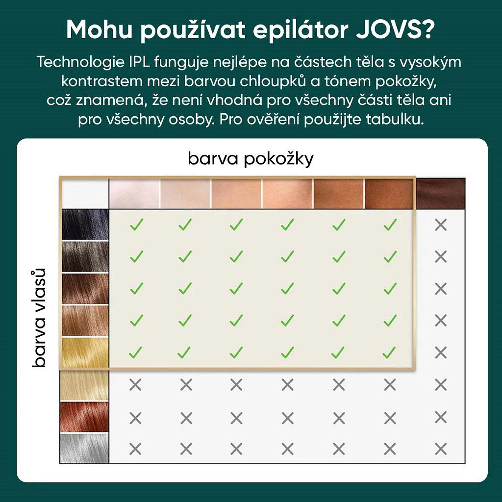 *Toto zařízení může používat kdokoli s typem pleti I až V na Fitzpatrickově stupnici. Pokud máte velmi tmavý odstín pleti (typ VI), toto zařízení prosím nepoužívejte. JOVS Pro II lze použít k ošetření tmavých blond až černých typů chloupků, ale nelze jej použít k ošetření světlých blond, zrzavých nebo šedivých chloupků.
