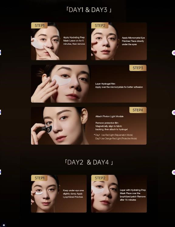 - Den 2 a 4 (Intenzivní výživa): Aplikujete lyofilizované náplasti s hydrolyzovaným kolagenem a peptidy a překryjete je hydratační maskou na 15 minut.