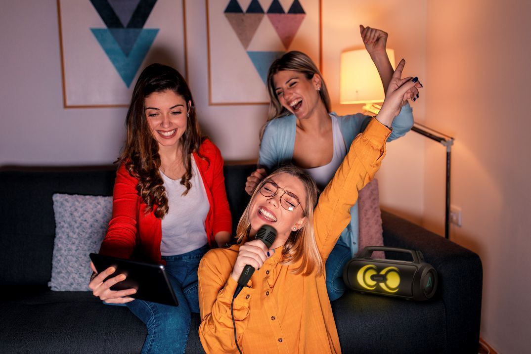 Mít připravený vlastní výběr party songů je top, ale když musíš improvizovat, hodí se i možnost naladit FM rádio a svojí oblíbenou stanici. Kteroukoliv akci si můžeš zkusit také odmoderovat díky přibalenému mikrofonu, který je parádní výbavou i pro karaoke. 3 režimy LED podsvícení na předním panelu ještě dotvoří atmošku. Svůj playlist pak spustíš přes Bluetooth 5.3, který se spáruje s různými zařízeními a je zárukou kvalitního přenosu až na 18 m. Nebo můžeš využít USB, microSD kartu, případně kabel.