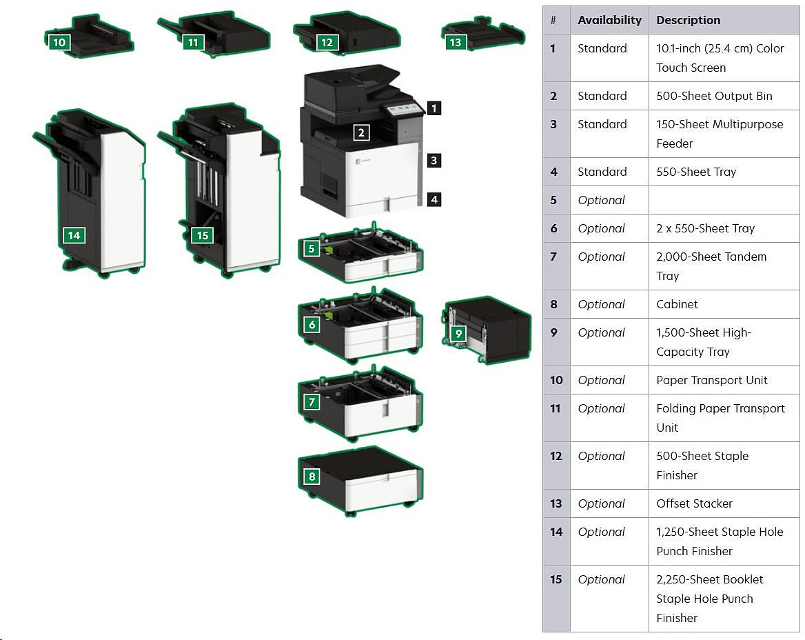 .Part Number 20L8300 Print Technology Color Laser Function Color Copying Color Faxing Color Printing Color Scanning Trusted Platform Module (TPM) The Trusted Platform Module (TPM) is not available in some countries. Workgroup Size Large Workgroup Touch Screen Display Yes Display Lexmark e-Task 10-inch (25 cm) class color touch screen Print Speed (Letter, Black) Up to 55 ppm4 Print Speed (Letter, Color) Up to 55 ppm4 Print Speed (Letter, Black) Duplex Up to 55 spm4 Print Speed (Letter, Color) Duplex Up to 55 spm4 Time to First Page (Black) As fast as 7.1 seconds Time to First Page (Color) As fast as 8.2 seconds Duplex (2-sided) Printing Integrated Duplex Print Resolution, Black 1200 x 1200 dpi 4800 Color Quality Print Resolution, Color 1200 x 1200 dpi 4800 Color Quality Copy Speed (Letter, Black) Up to 55 cpm4 Copy Speed (Letter, Color) Up to 55 cpm4 Copy Speed (Letter, Black) Duplex Up to 55 spm4 Copy Speed (Letter, Color) Duplex Up to 55 spm4 Time to First Copy (Black) As fast as 8.5 seconds Time to First Copy (Color) As fast as 9.5 seconds Reduce / Enlarge Range 25 - 400 % A4/Ltr Simplex Scan Speed (Black) Up to 120/120 sides per minute A4/Ltr Simplex Scan Speed (Color) Up to 120/120 sides per minute A4/Ltr Duplex Scan Speed (Black) Up to 240/240 sides per minute A4/Ltr Duplex Scan Speed (Color) Up to 240/240 sides per minute Scan Area, Maximum 11.69 x 17.0 inches ADF Scan DADF (single pass Duplex) Scanner Type Flatbed scanner with automatic document feeder Scan Resolution, Enhanced 600 x 600 dpi Scan Resolution, Optical 300 x 300 dpi Optical Scanning Resolution 300 X 300 dpi Scan File Formats (Send as) JPEG, JPG PDF Secure PDF TIFF Archival PDF (A-1a, A-1b) Searchable PDF TXT RTF DOCX Scan Destinations e-mail FTP USB Flash drive USB or Network connected computer Processor Speed Quad Core, 1.2 GHz Memory, Standard 4 GB Memory, Maximum 4 GB Hard Disk Intelligent Storage Drive included; Magnetic Hard Disk available Apple Operating Systems Supported Support is provided through AirPrint and AirScan only Citrix MetaFrame Microsoft Windows Server 2012 R2 Datacenter Edition running Citrix XenApp 7.5, 6, 7, 8, 9, 11, 12, 13, 14, 15, 16 Microsoft Windows Server 2012 Datacenter Edition running Citrix XenApp 7.5, 6, 7, 8, 9, 11, 12, 13, 14, 15, 16 Microsoft Windows Server 2012 Foundation running Citrix XenApp 6.0, 6.5 Microsoft Windows Server 2012 Essentials running Citrix XenApp 6.0, 6.5 Microsoft Windows Server 2012 Standard running Citrix XenApp 6.0, 6.5 Linux Operating Systems Supported Ubuntu 20.04 Debian 10 SUSE Linux Enterprise Server 12 SP5 OpenSUSE 15.2 Debian 11 Ubuntu 22.04 Fedora 36 Fedora 37 SUSE Linux Enterprise Server 15 SP4 OpenSUSE 15.4 Red Hat Linux 8.7 Red Hat Linux 9.1 Microsoft Windows Operating Systems Supported Windows Vista Windows Vista x64 Windows Server 2008 Windows Server 2008 x64 Windows Server 2008 running Terminal Services Windows Server 2008 x64 running Terminal Services Windows 7 Windows 7 x64 Windows Server 2008 R2 Windows Server 2008 R2 running Terminal Services Windows 8 Windows 8 x64 Windows Server 2012 Windows 8.1 Windows Server 2012 R2 Windows 10 Windows Server 2016 Windows Server 2019 Windows Server 2022 Windows 11 Novell Operating Systems Supported Novell NetWare 6.5 Open Enterprise Server Novell Open Enterprise Server 2 (SP3) on SuSE Linux Enterprise Server 10 SP4 (x86 and x64) 3 Novell Open Enterprise Server 11 (SP3) on SuSE Linux Enterprise Server 11 SP4 (x86 and x64) Novell Open Enterprise Server 11 (SP3) on SuSE Linux Enterprise Server 12 SP1 (x86 and x64) Novell Open Enterprise Server 15 (SP1) on SuSE Linux Enterprise Server 11 SP4 (x86 and x64) Other Operating Systems Supported Virtually any platform supporting TCP/IP Included Paper Handling 550-Sheet Tray 150-Sheet Multipurpose Feeder 500-Sheet Output Bin Optional Paper Handling 550-Sheet Tray Offset Stacker 500-Sheet Staple Offset Finisher 2 x 550-Sheet Tray 2000-Sheet Tandem Tray Cabinet 1,500-Sheet High-Capacity Tray Paper Transport Unit Folding Paper Transport Unit 1,250-Sheet Staple Hole Punch Finisher 2,250-Sheet Booklet Staple Hole Punch Finisher Paper Input Capacity, Standard Up to 700 pages 20 lb or 75 gsm bond Paper Input Capacity, Maximum Up to 4750 pages 20 lb or 75 gsm bond Paper Output Capacity, Standard Up to 500 pages 20 lb or 75 gsm bond Paper Output Capacity, Maximum Up to 2650 pages 20 lb or 75 gsm bond Paper Weight Range Supported - Standard Tray (lb.) 16 - 80 lb. Paper Weight Range Supported - Multipurpose Feeder (lb.) 16 - 80 lb. A3 / 11 x 17 Yes ADF 300-Sheet Automatic Document Feeder ADF Paper Input Capacity Up to 300 pages 20 lb or 75 gsm bond ADF Paper Output Capacity Up to 300 pages 20 lb or 75 gsm bond Finishing Option Yes Finishing Functions Offset stacking Stapling Hole punching Number of Paper Inputs, Standard 2 Number of Paper Inputs, Maximum 6 Media Types Supported Card Stock Envelopes Glossy Paper Labels Plain Paper Vinyl Labels Refer to the Paper & Specialty Media Guide Media Sizes Supported 10 Envelope 7 3/4 Envelope 9 Envelope A3 A4 A5 B5 Envelope C4 Envelope C5 Envelope DL Envelope Hagaki Card Executive Folio JIS-B4 JIS-B5 Ledger Legal Letter Statement Oficio A6 SRA3 Standard Ports USB 2.0 Specification Hi-Speed Certified (Type B) Gigabit Ethernet (10/100/1000) Front USB 2.0 Specification Hi-Speed Certified port (Type A) 802.11a/b/g/n/ac + Apple iBeacon Optional Local Ports Internal RS-232C serial Internal 1284-B Bidirectional Parallel Optional Network Ports MarkNet N8230 Fiber Ethernet Print Server Direct USB Yes Ethernet Network Yes Wireless Yes Wireless Network WPA2™ - Personal WPA™ and WPA2™ - Personal 802.1x Authentication: MD5, MSCHAPv2, LEAP, PEAP, TLS, TTLS Network Protocol Support TCP UDP IPSEC w/ IPv4 IPSEC w/ IPv6 ICMP IGMP IPv4 IPv6 Network Printing Methods Direct IP (Port 9100) Enhanced IP (Port 9400) FTP IPP 1.0, 1.1, 2.0 (Internet Printing Protocol) Microsoft Web Services WSD Pull Printing Thin Print LPR Network Management Protocols WINS AP