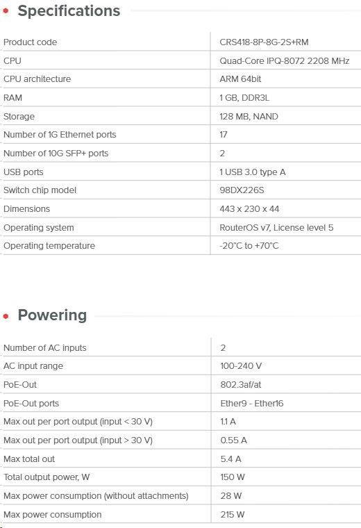 PoE CRS switch s 16x Gbps LAN (8 z nich s POE-out) , 2x 10Gbps SFP+, 1x USB 3.0 a dvěma RJ45 porty (management a konzole) v rack provedení. CRS418-8P-8G-2S+RM je dostatečně výkonný na to, aby nahradil většinu routerů pro malé a střední kanceláře. Vhodný především pro hybridní sítě na 2/3 vrstvě - ať už segmentujete síť pomocí VLAN, nebo mezi nimi routujete. Díky čtyřjádrovému procesoru ARM s frekvencí 2,2 GHz, HW offloading L3 a systému RouterOS v7 jej můžete používat jako internetovou bránu, firewall, a dokonce i jako řadič CAPsMAN. Využít můžete 8 PoE-out portů (802.3af/at a 24V pasivní PoE-out) pro napájení zařízení přímo ze switche s až 150 W celkového výkonu, inteligentním řízením PoE a omezením proudu na port. Praktické řešení pro instalace vyžadující nepřetržitý provoz s enormními objemy dat Technické specifikace: Product code: CRS418-8P-8G-2S+RM CPU: Quad-Core IPQ-8072 2208 MHz Size of RAM: 1 GB, DDR3L Storage: 128 MB, NAND Number of 1 GbE Ethernet ports: 17 10G SFP+ ports: 2 USB ports: 1 USB 3.0 type A Operating system: RouterOS v7 (License level 5) Supported input voltage: 2x AC power supply 100 - 240 V Dimensions: 443 x 230 x 44 mm Operating temperature: -20°C to +70°C Napájecí specifikace: PoE-out: 802.3af/at PoE-out ports: Ether9 - Ether16 Max out per port output (input < 30 V) : 1.1 A Max out per port output (input > 30 V): 0.55 A Max total out : 5.4 A Total output power, W: 150 W Max power consumption: 215 W Max power consumption without attachments: 28 W Upozornění: Výrobce MIKROTIK nevztahuje záruku na zařízení poškozená přepětím. Zařízení je třeba na vstupech adekvátně chránit proti indukovanému elektrostatickému přepětí či přepěťovým špičkám na silovém vedení. Při venkovních instalacích je třeba používat stíněnou kabeláž (FTP/SFTP), příslušné přepěťové ochrany (pokud nejsou integrovány) a provést korektní a efektivní uzemnění. Zařízení vždy provozujte s poslední výrobcem publikovanou verzí (výrobcem označenou "Stable") operačního systému RouterOS. Taková verze garantuje nejoptimálnější funčknost, obsahuje opravené chyby z verzí předchozích a výkonová vylepšení..