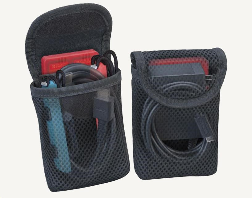 • Dvě vyjímatelné síťované kapsy pojmou napájecí adaptér s kabelem, propojovací HDMI kabel, řemínky na zápěstí pro ovladače Joy-Con 2 i přiložená plastová pouzdra pro herní a microSD karty.
