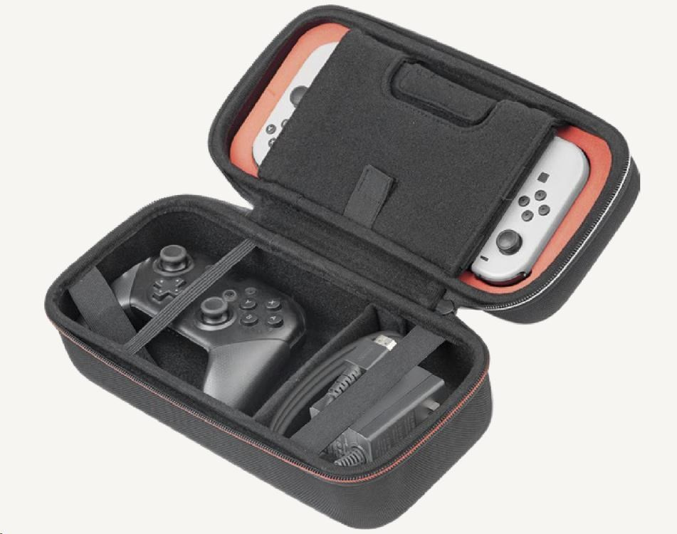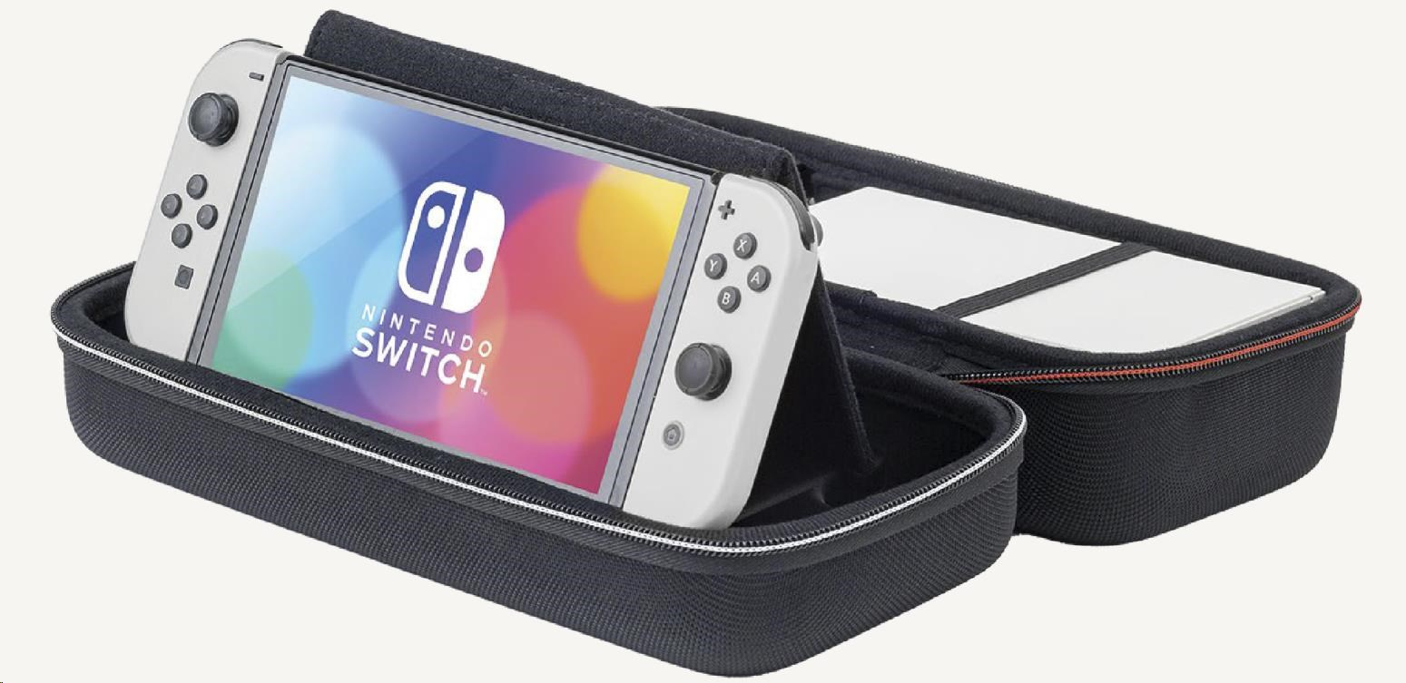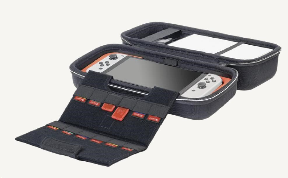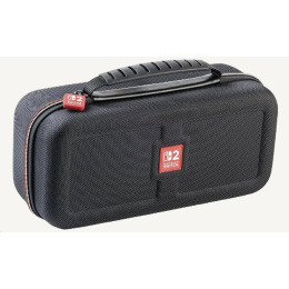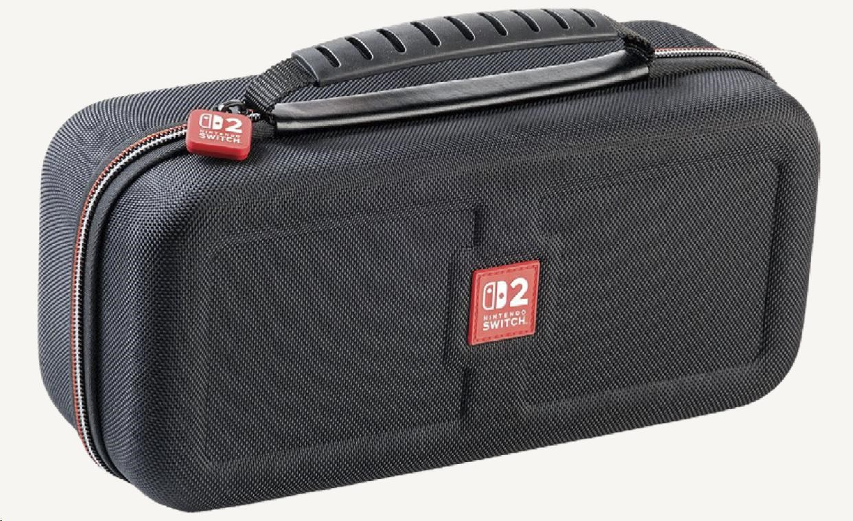 Toto větší přepravní pouzdro od společnosti Nacon oceníte, pokud budete chtít bezpečně a pohodlně přenášet svoji herní konzoli Nintendo Switch 2 včetně jejího základního příslušenství. Pouzdro pojme nejen samotnou konzoli, ale podle potřeby i dokovací stanici, nový ovladač Pro Controller nebo držák Joy-Con 2 Charging Grip. Zároveň nabízí také samostatnou přihrádku pro napájecí adaptér s kabelem a propojovací HDMI kabel. Nastavitelný stojánek v horní části pouzdra, při hraní umožňující pohodlněji sledovat dění na obrazovce, ochrání během přepravy jak obrazovku, tak i analogové páčky konzole a na jeho vnitřní straně navíc naleznete dvanáct kapsiček pro uložení herních karet. Součástí balení jsou pak také dvě menší plastová pouzdra pro microSD karty a čisticí hadřík s logem Nintendo Switch 2. Pouzdro je kompatibilní rovněž s konzolemi Switch a Switch – OLED Model, včetně jejich příslušenství.