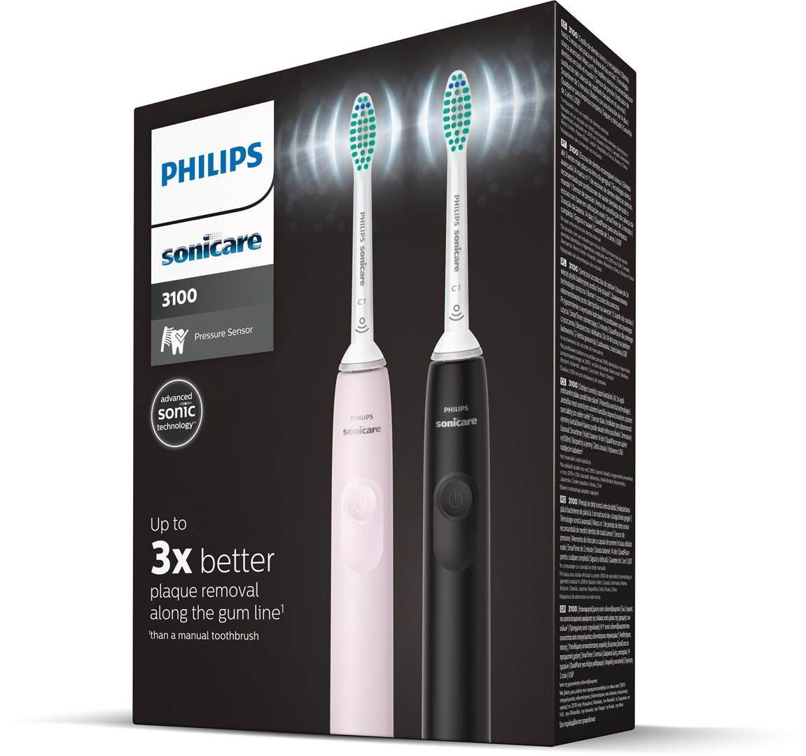 Sada 2 sonických zubních kartáčků s 31 000 pohyby za minutu. Philips Sonicare 3100 1+1 HX3675/15 nabízí tlakový senzor pro šetrné čištění, 1 režim čištění a tenký ergonomický design pro snadné použití..