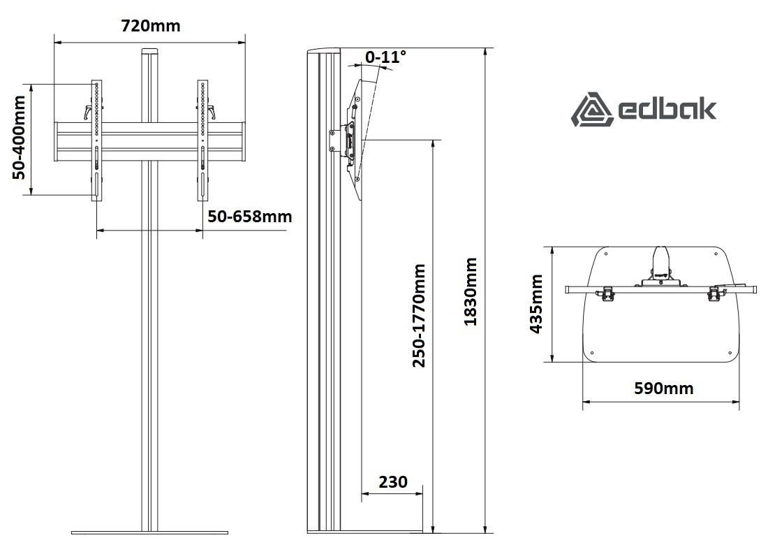 Profesionální Tv stojan Edbak STDV100 Stojan na Tv a monitory 40-75", nastavitelná výška obrazovky 250-1770mm, náklon 0°/-11°, vedení kabeláže, VESA 75x75 až 600x400, nosnost 80kg, Profesionální designový stojan pro zavěšení televizorů, monitorů a dotykových obrazovek s úhlopříčkou 40" až 75". Stojan je vyroben z hliníku, podstava je z litiny o rozměrech 590x435x10mm. Podstavu je nutné ukotvit do podlahy nebo připraveného podstavce - není samostojný. Obrazovky je na stojanu možné nastavit do potřebné výšky od 250mm až do 1770mm (vzdálenost od podlahy po střed obrazovky) a nastavit náklon od 0° až do -11°. Stojan je možné zakoupit včetně poličky na příslušenství a poličky na kameru. Stojan podporuje VESA standardy 75x75 až 600x400 a má nosnost 80kg. Materiál hliník a litina. Poličky jsou kovové. Instalační materiál. Záruka 5 let. Profesionální designový podlahový stojan na televize, monitory a dotykové obrazovky Edbak STDV100 Technické údaje: nosnost 80kg podporuje VESA standardy 75x75 až 600x400 na televize, monitory a dotykové obrazovky 40" až 75" celková výška stojanu 1830mm nastavitelná výška obrazovky 250-1770mm (od podlahy po střed obrazovky) nastavitelný náklon obrazovky 0° až -11° podstava s otvory pro ukotvení do podlahy rozměry podstavy 590x435x10mm možnost zakoupení i s poličkou na příslušenství 400x300mm, nosnost 10kg možnost zakoupení i s poličkou na kameru 250x200mm, nosnost 10kg materiál hliník a litina profesionální výrobek nejvyšší kvality barevné provedení černé záruka 5 let Detaily Tv stojanu Edbak STDV100 Tv stojany Edbak STDV100 podporují VESA standardy: VESA 75x75 VESA 100x100 VESA 200x100 a 100x200 VESA 200x200 VESA 300x200 a 200x300 VESA 300x300 VESA 400x200 a 200x400 VESA 400x300 a 300x400 VESA 400x400 VESA 600x400 Stojan je možné zakoupit včetně poličky na příslušenství a poličky na kameru. Poličky jsou kovové a mají nosnost 10kg..