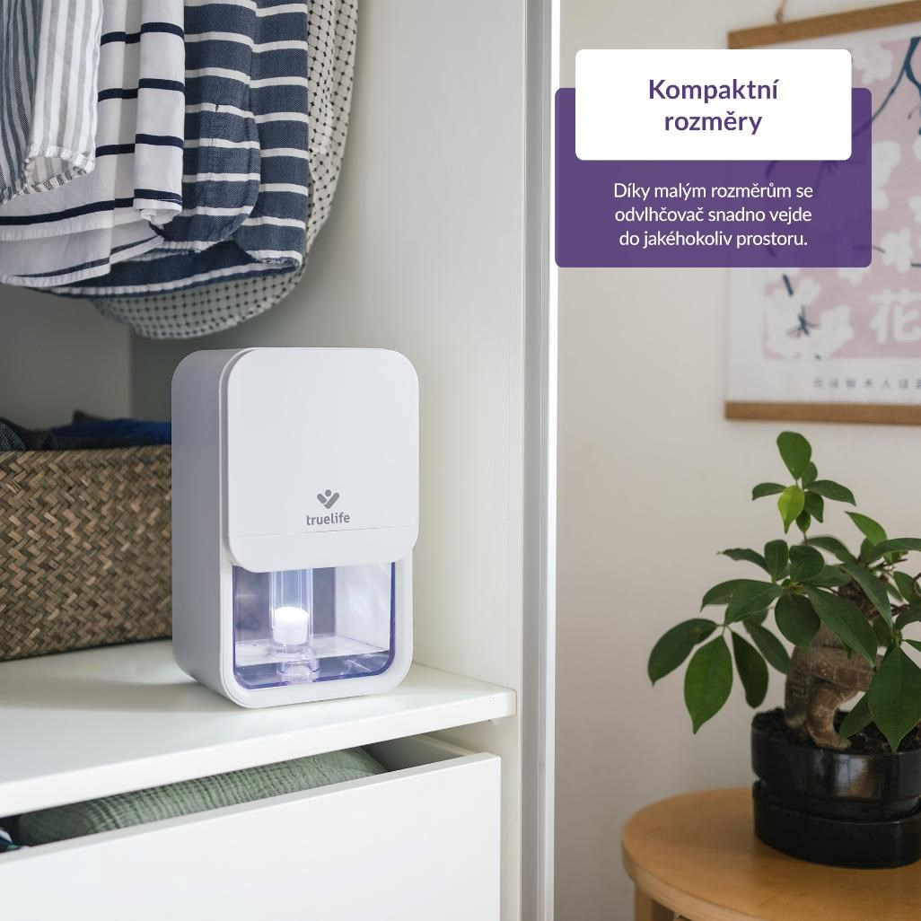 TrueLife AIR Dehumidifier DH3 byl navržen s ohledem na každodenní realitu, tudíž jeho hlavním cílem je, aby fungoval spolehlivě, ale zároveň nezabíral moc místa. Díky svému elegantnímu a prostorově úspornému designu se snadno vejde do ložnice, obýváku i kanceláře, aniž by narušil vzhled interiéru. Přesto dokáže efektivně snižovat vlhkost v místnosti a vytvořit zdravější prostředí, ve kterém se vám bude lépe dýchat.